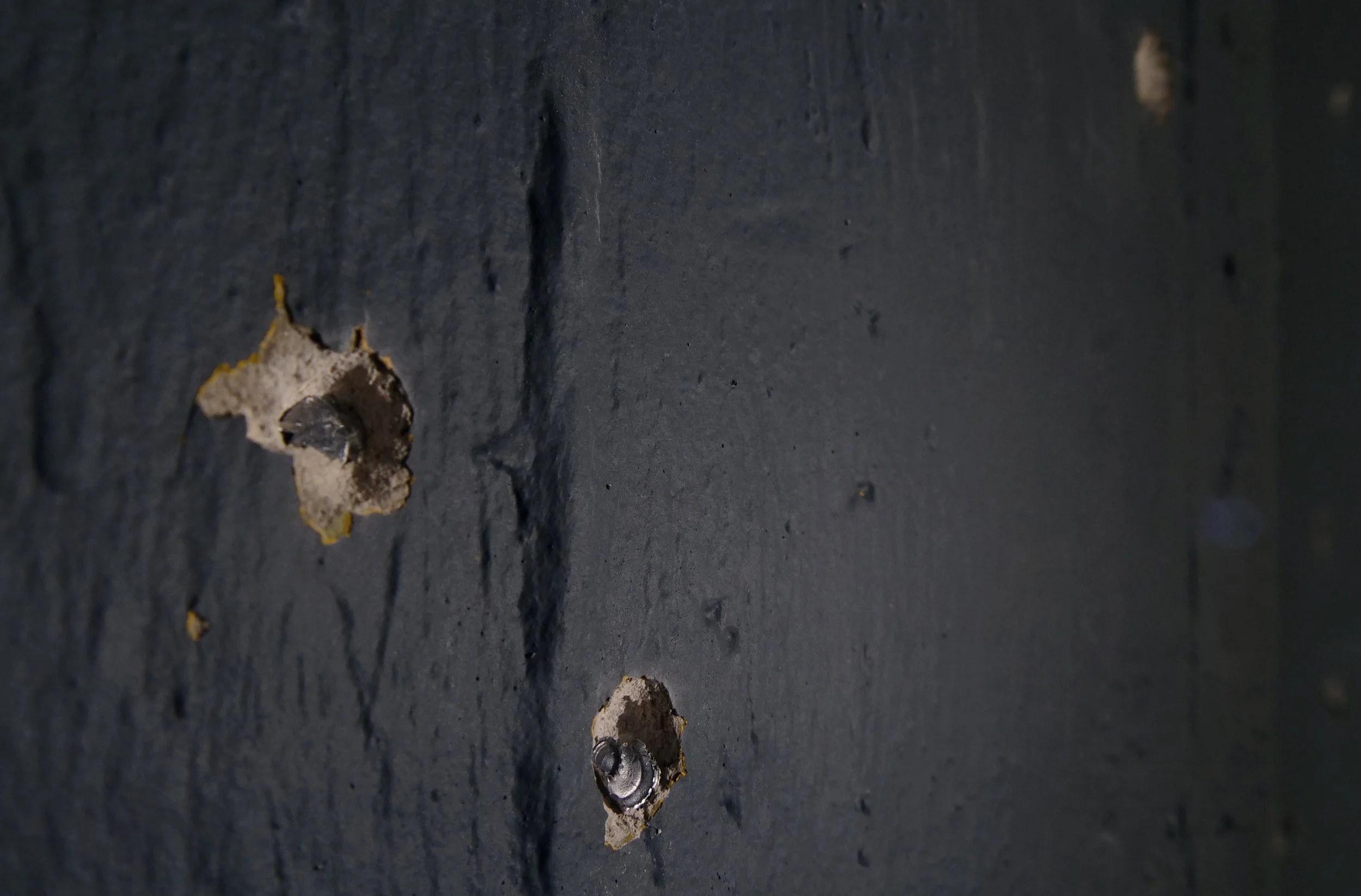 With a combination of destructive technique and a statement of solidarity, the work reflected the state of general civilizational anesthesia. On the destroyed wall, a pointillist inscription is visible: I can not even think about art.