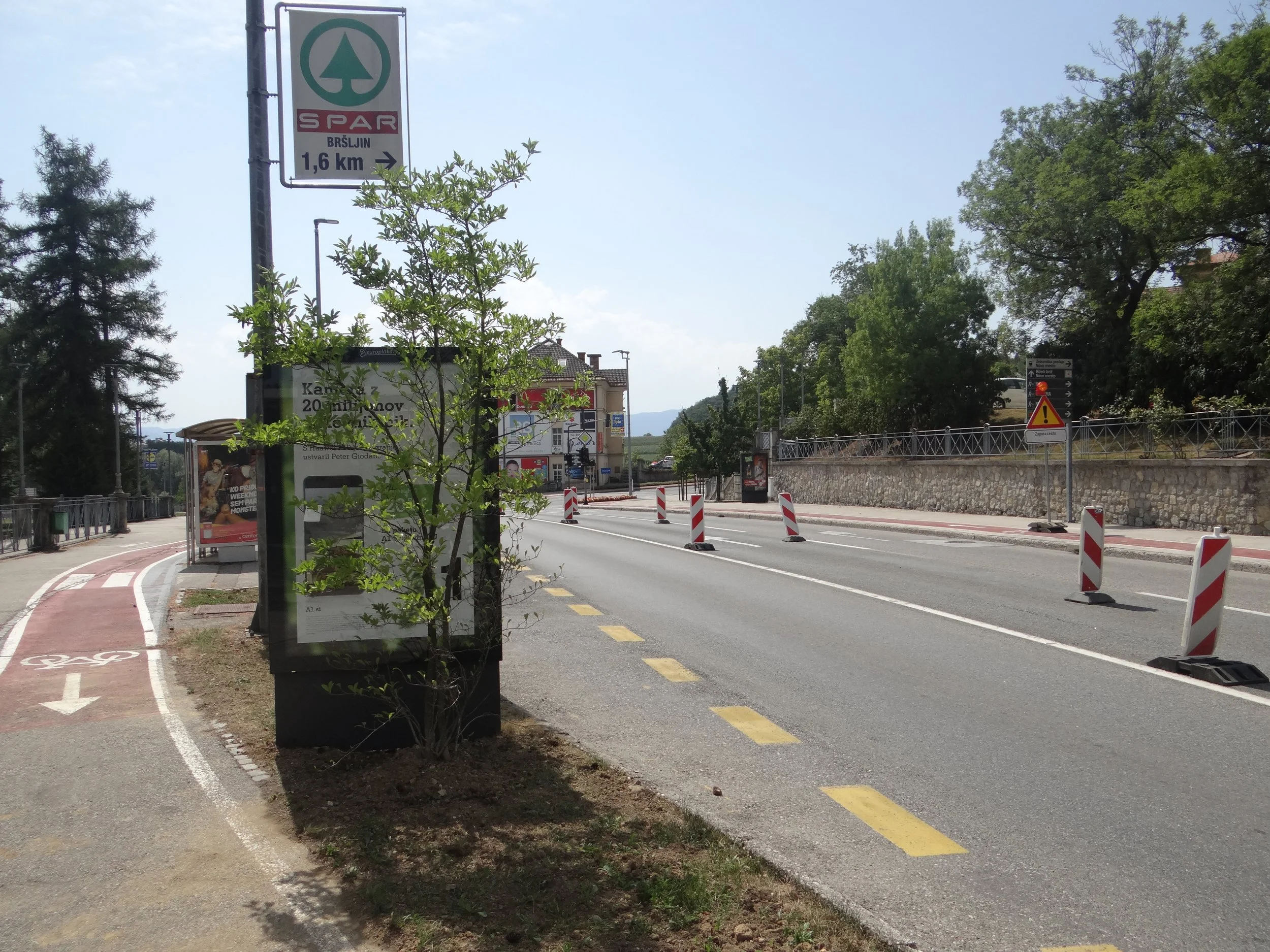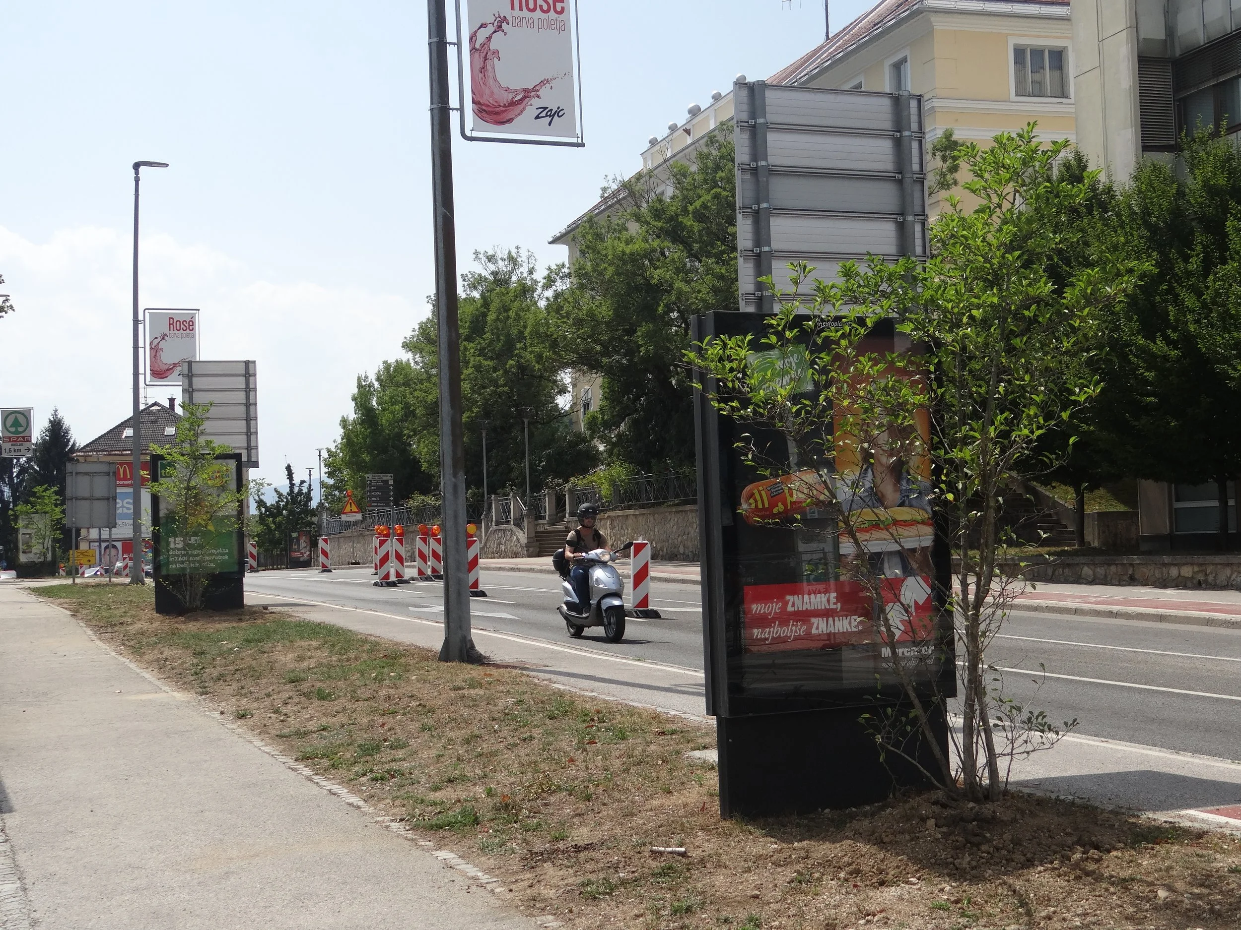 The second series of interventions happened in Novo Mesto in 2017 during the reconstruction of a street named after the ecologist and environmentalist Ferdinand Seidl. The paradox is that this street is one with the most advertisement panels in town. Because the intervention took place during the reconstruction period, the trees kept standing for four months. 4 panels were hacked. During this time, the advertised content was regularly changing, and the plants were watered by Marija, a local woman who approached me during the intervention implementation.