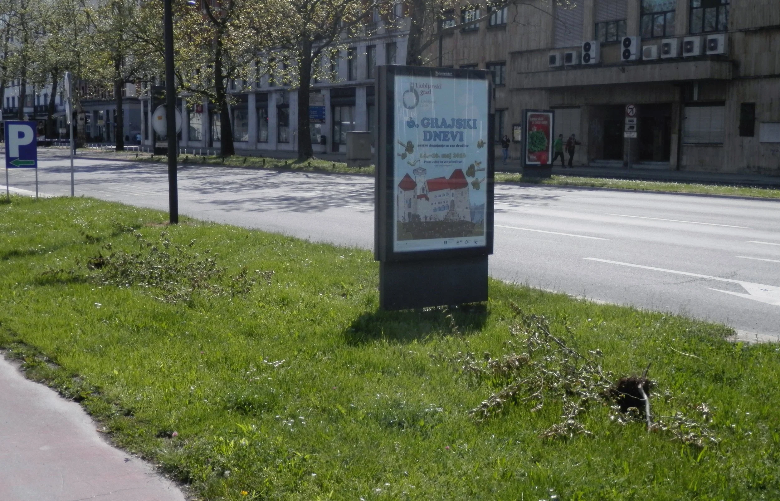The first realization from 2016 in Ljubljana caused an intense reaction from the marketing agency. 8 panels were hacked. After 3 days, the trees were chopped off and left lying on the spot.
