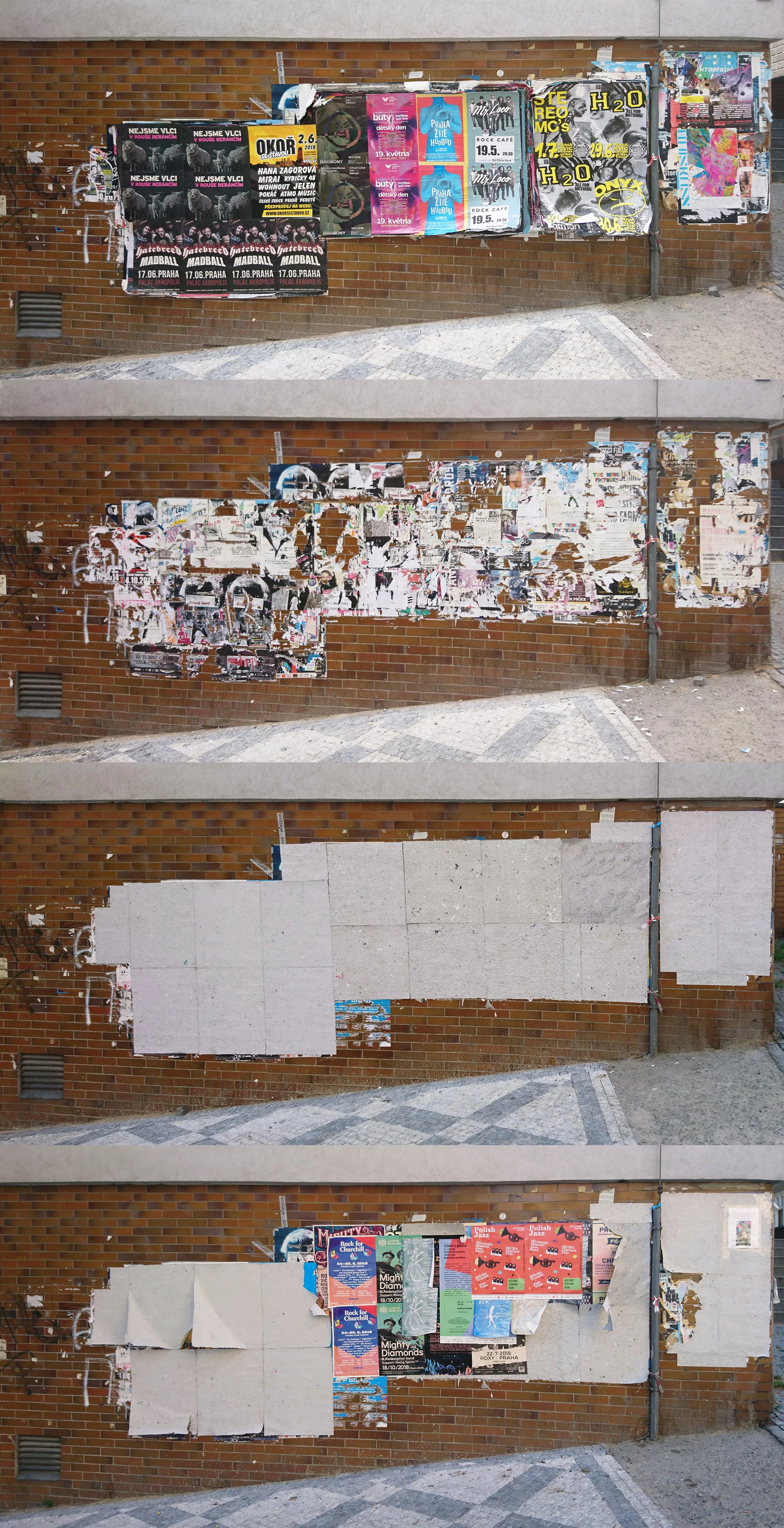 First, I began to document these spontaneously formed masses. Then, I removed the posters at selected locations and developed them into new paper through a recycling process. I then returned the recycled paper to the same walls, following the composition of the posters before they were removed. The authentic paper, in a modified form, replaced itself, with loss of its basic function – information. The result of the intervention was a visually clean surface that appeared as a gray anomaly in the space. The abstract forms remained on the wall and were visible until they were covered with new posters.