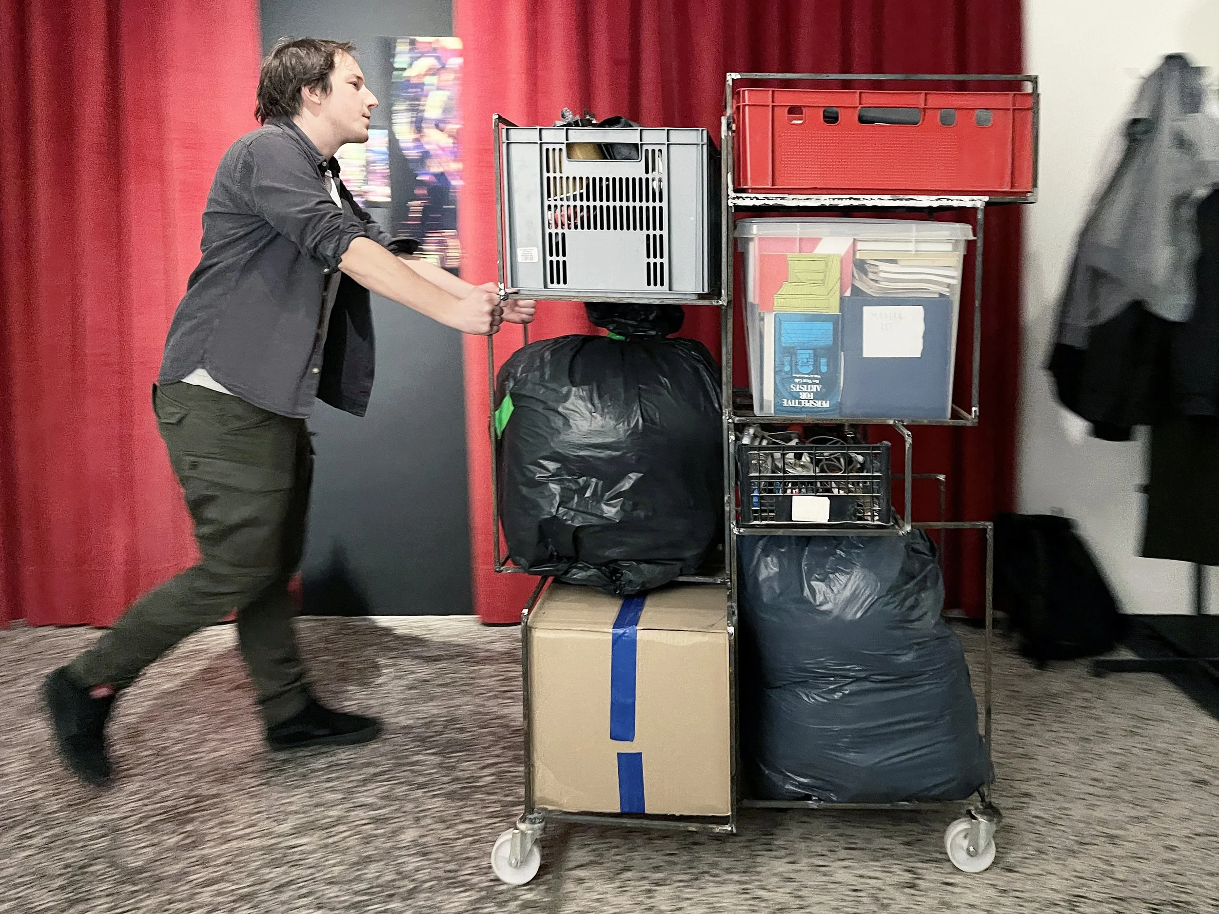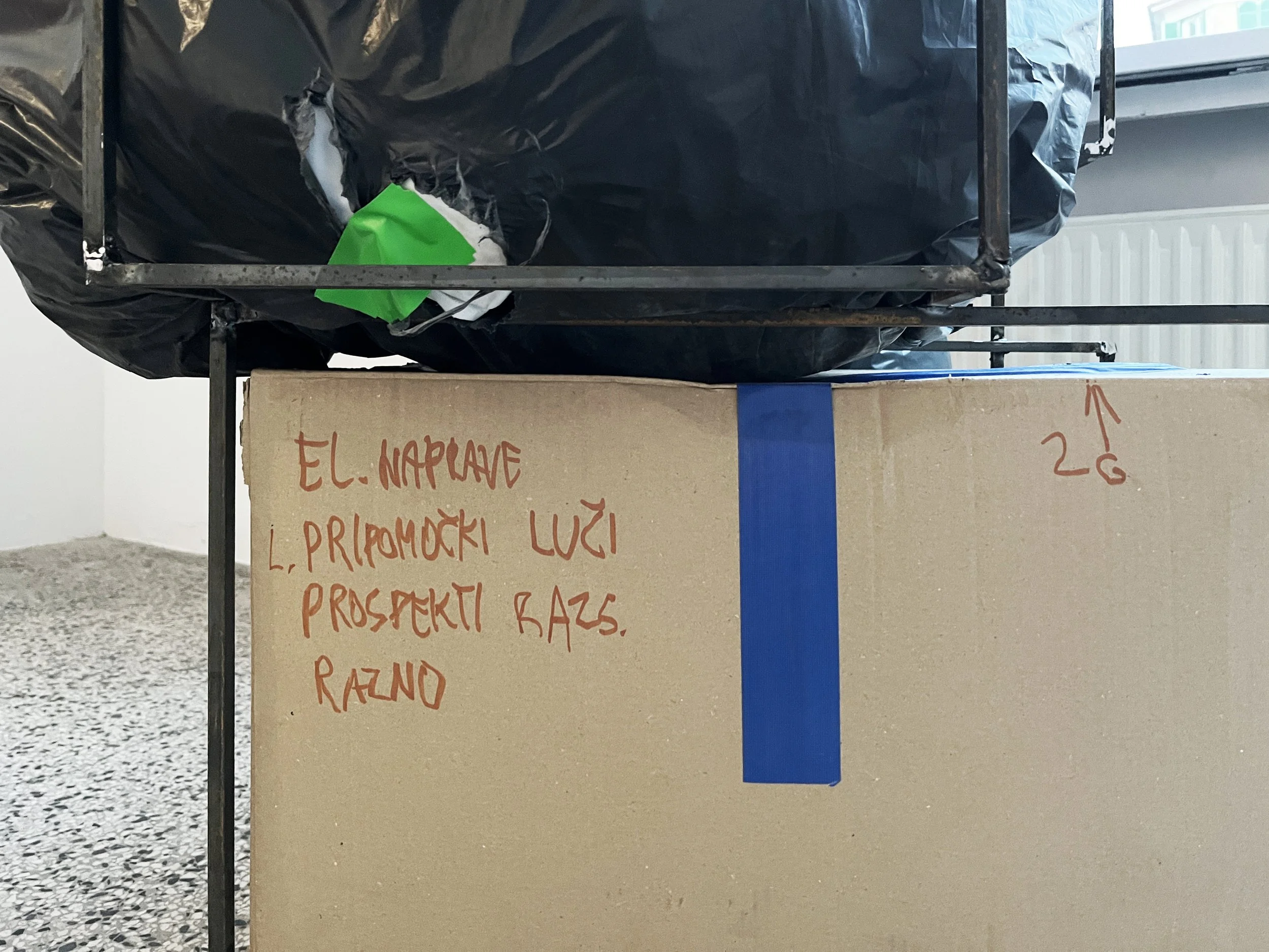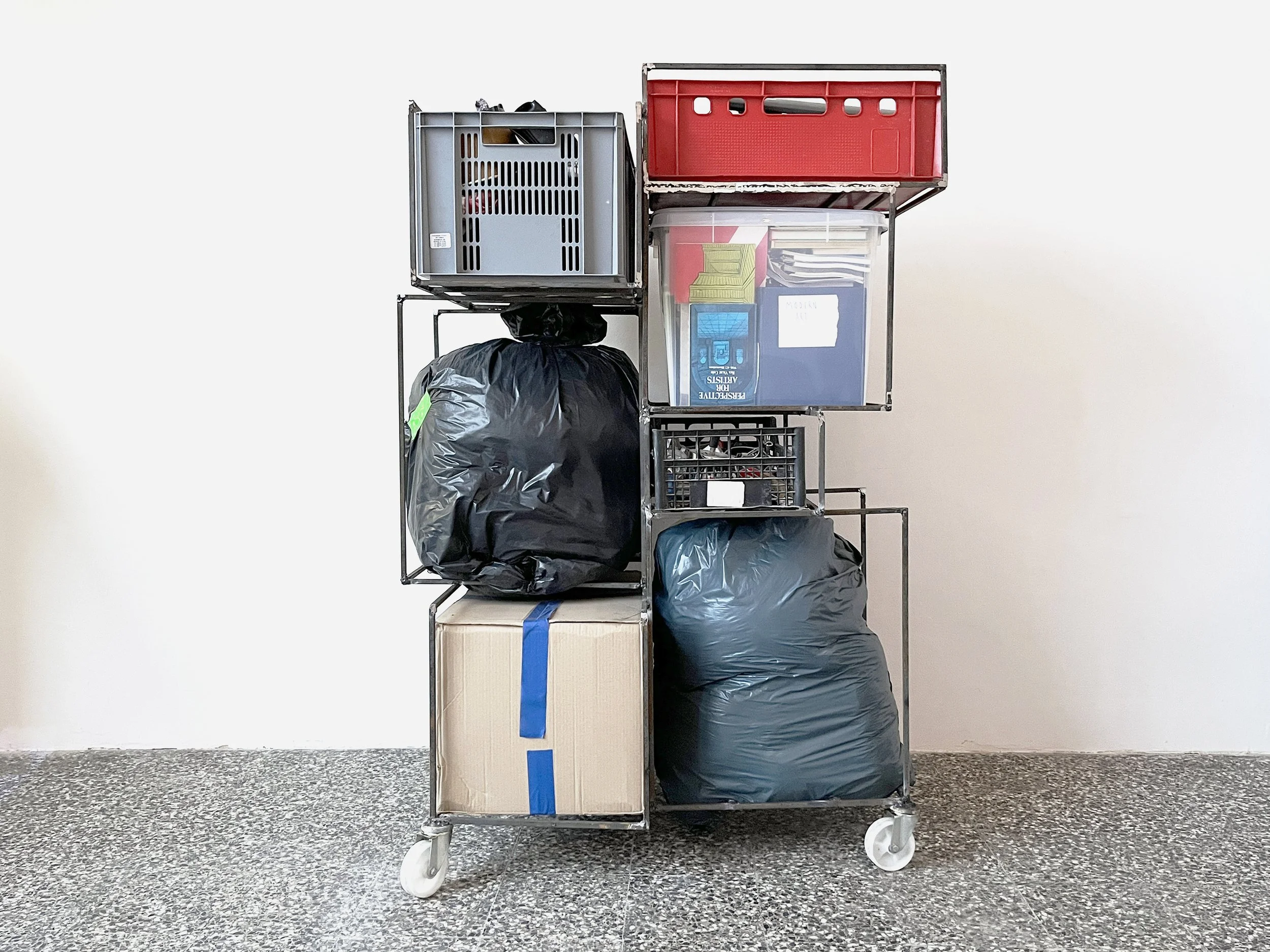 The installation stems from a subjective experience, which is certainly part of the collective experience of many urban nomads. When you move, you often can't take everything with you, but you also don't want to get rid of it forever either. As a result, personal belongings become junk in the attic, in the basement, under the bed, or in the closets of relatives and friends. Those objects, packed in boxes and plastic bags accumulate like sediment, both in space and in your subconscious. Motivated by the theme of a group exhibition that dealt with the issue of home, I decided to collect all my belongings that had temporarily stayed at the homes of family members and friends for many years.