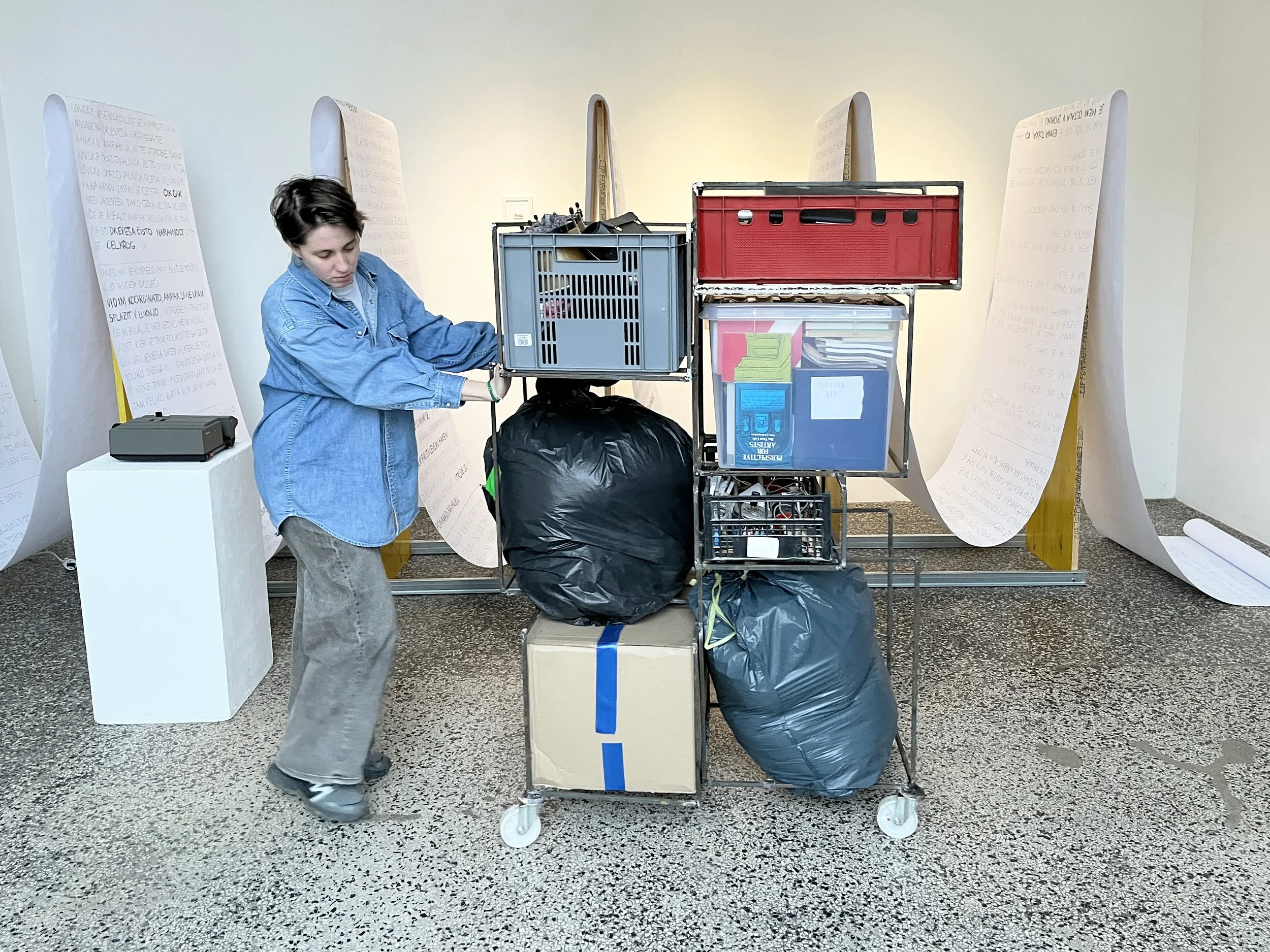 I used the objects as the starting point for the installation, thinking about their basic characteristic - physicality, which tends to economical use of space. Based on the shapes and sizes of individual packages, inside which personal items are stacked, I created shelves. Although they followed geometric forms, the dynamic construction of the shelves invaded the space and defied the logic of storage against the wall or in the corner of the room. The shelves were on wheels, which allowed them to be moved around the space, finding the least disruptive or most appropriate position.