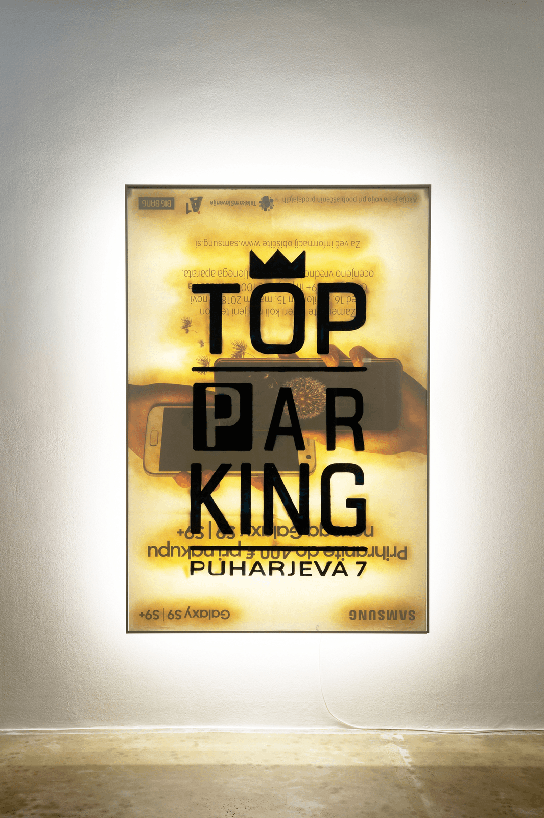 In addition to painting parking spaces, the project was completed by two more actions. Firstly, the parking ticket office was installed, which is a wooden structure with plastic advertisements of actual parking lots. Secondly, I summed up the turbo competitive advertising logic, seen in emphasizing the words top and king as something superior to the competition. The advertisement posters for top parking were created on the back sides of authentic posters and were then installed on city-light boxes throughout the city, replacing the existing ones.