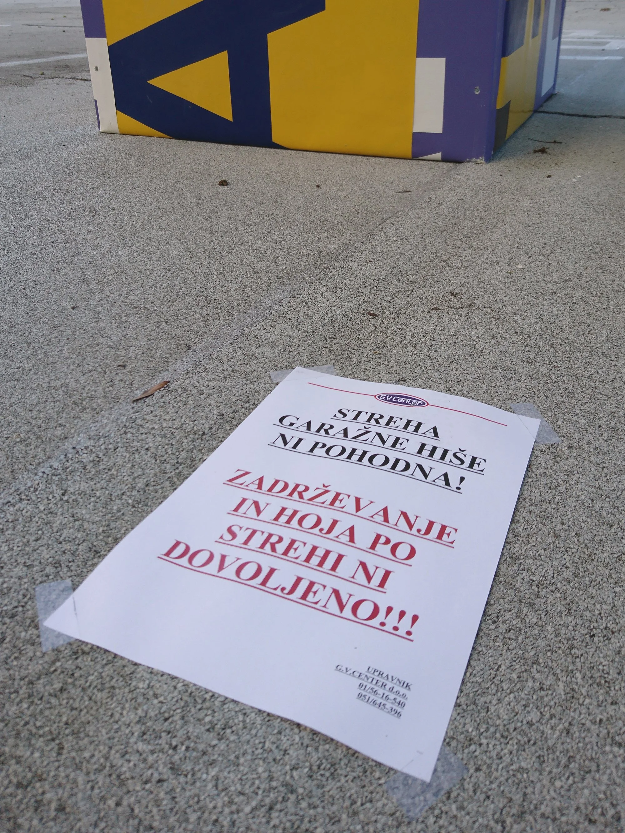 While observing and visiting them, I decided to symbolically establish another parking lot. Since it was meant to be a guerilla public intervention and not a functional parking, it took place at a location inaccessible to vehicles. The intervention was carried out on a 1m high platform, which is actually the roof of underground private garages. The title Top refers not only to the location but also to the word TOP as “the best”.