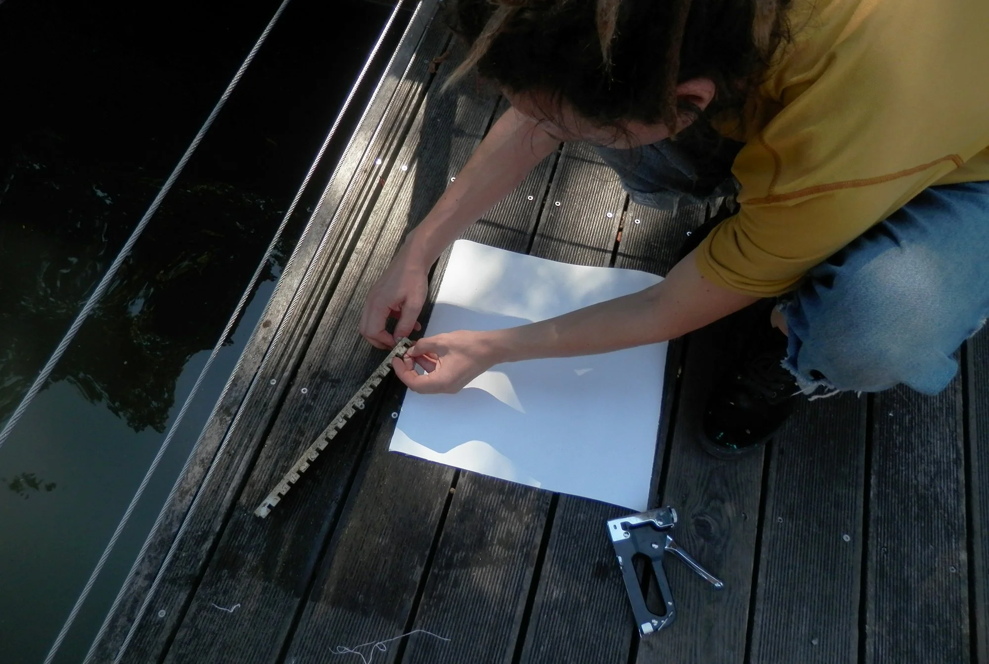 The idea of the project was to document the traces that the river current leaves on concrete river banks in an urban space. For this purpose, I attached a subframe at a suitable location, half of which was submerged in water, while the other half remained above the surface. Then a canvas (30 × 30 cm) was installed over the sub-frame and left there for a month. Each month for twelve months, from April 2016 to March 2017, I installed a fresh canvas closing the cycle of the four seasons.