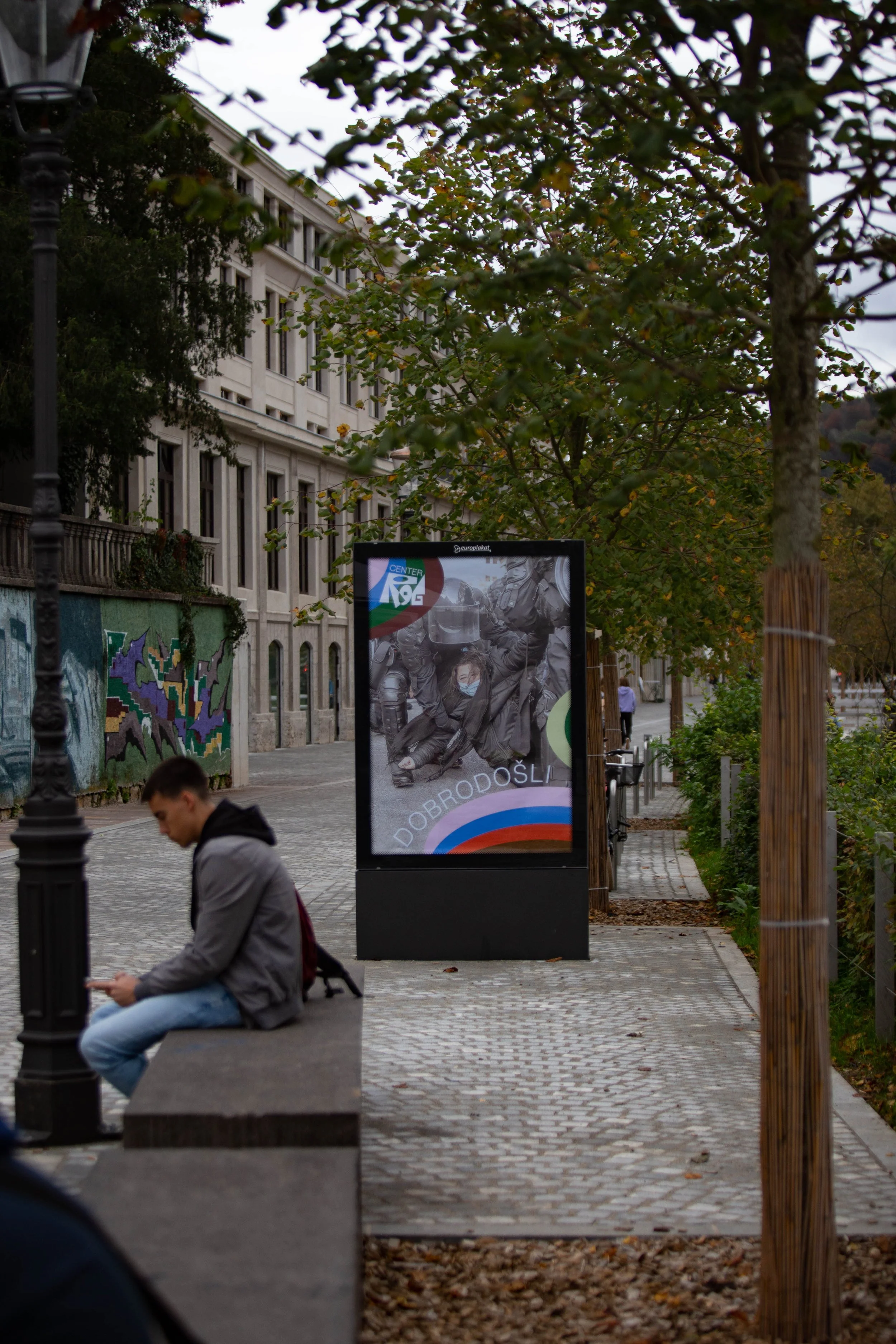 Za otvoritveni dan sem pripravil plakate, ki združujejo fotografije evikcije z novo vizualno podobo Centra. Plakati so bili gverilsko nameščeni v neposredni bližini centra iz vseh prihodnih smeri, uro pred odprtjem. Na plakatih je izstopala beseda dobrodošli.